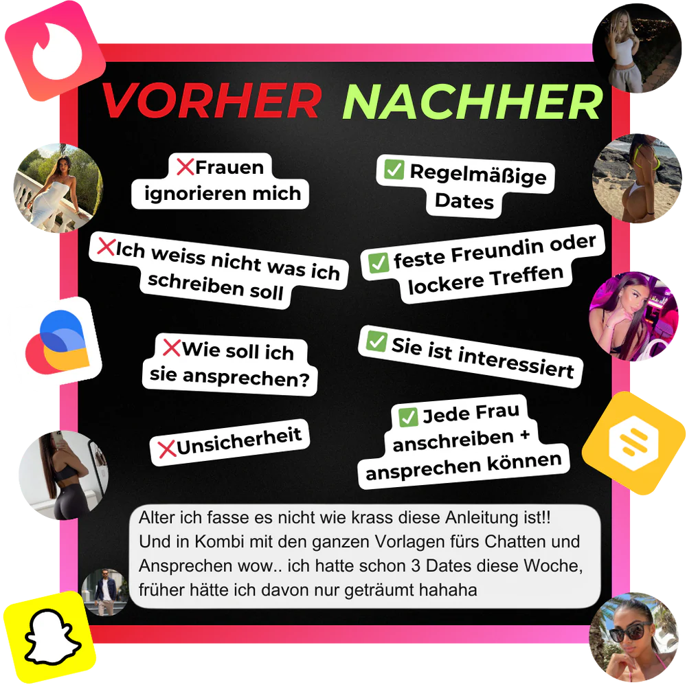 Dieses E-Book liefert dir direkt umsetzbare Lösungen statt leeres Gelaber. Du bekommst 40 Chatvorlagen fürs Anschreiben auf Tinder, Instagram & Co. plus 20 Gesprächsöffner für jede Situation – Straße, Gym, Club oder Social Media. Keine Grübelei mehr, was du sagen sollst. Du hast Vorlagen, die funktionieren und sofort Reaktionen erzeugen.